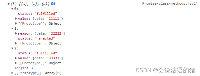 该方法会在所有的Promise都有结果时(无论是fulfilled,还是rejected)都会在then方法中拿到我们的最终的结果: