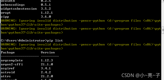 目录 关于 WARNING: Ignoring invalid distribution -pencv-python … 警告信息 解决方法: 结束 关于 WARNING: Ignoring invalid distribution -pencv-python … 警告信息 在查看命令行窗口输入 pip list ,出现下面的警告提示 解决方法: 根据警告提示信息,找到目录,然后删掉带~开头的文件夹. 这是之前安装插件失败/中途退出,导致插件安装出现异常导致的. 删除后,在此查看信息,警告信息就