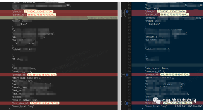 通过前期的方案设计和比较,我们决定通过 elasticdump 工具来做 ES 的数据迁移,这个也是比较普遍的迁移方案,于是就动手实施了,过程中也没遇到什么问题。在最后的数据验证环节,发现有一个 ID 对应不上了,如下图所示,通过对比工具,发现一个长度较大的 ID 发生了偏移,其他的数据都没有问题。这是为什么呢?一头雾水。