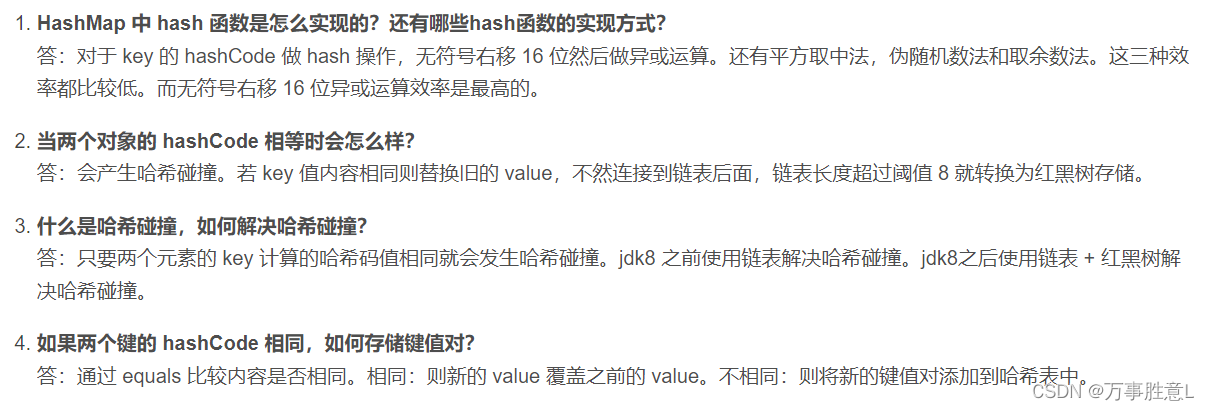 通过hash的方法,通过put和get存储和获取对象。存储对象时,我们将K/V传给put方法时,它调用hashCode计算hash从而得到bucket位置,进一步存储,HashMapJava集合——HashMap会根据当前bucket的占用情况自动调整容量(超过 Load Facotr 则resize为原来的2倍)。获取对象时,我们将K传给get,它调用hashCode计算hash从而得到bucket位置,并进一步调用equals()方法确定键值对。如果发生碰撞的时候,Hashmap通过链表将产生碰撞冲突的元素组织起来,在Java 8中,如果一个bucket中碰撞冲突的元素超过某个限制(默认是8),则使用红黑树来替换链表,从而提高速度。