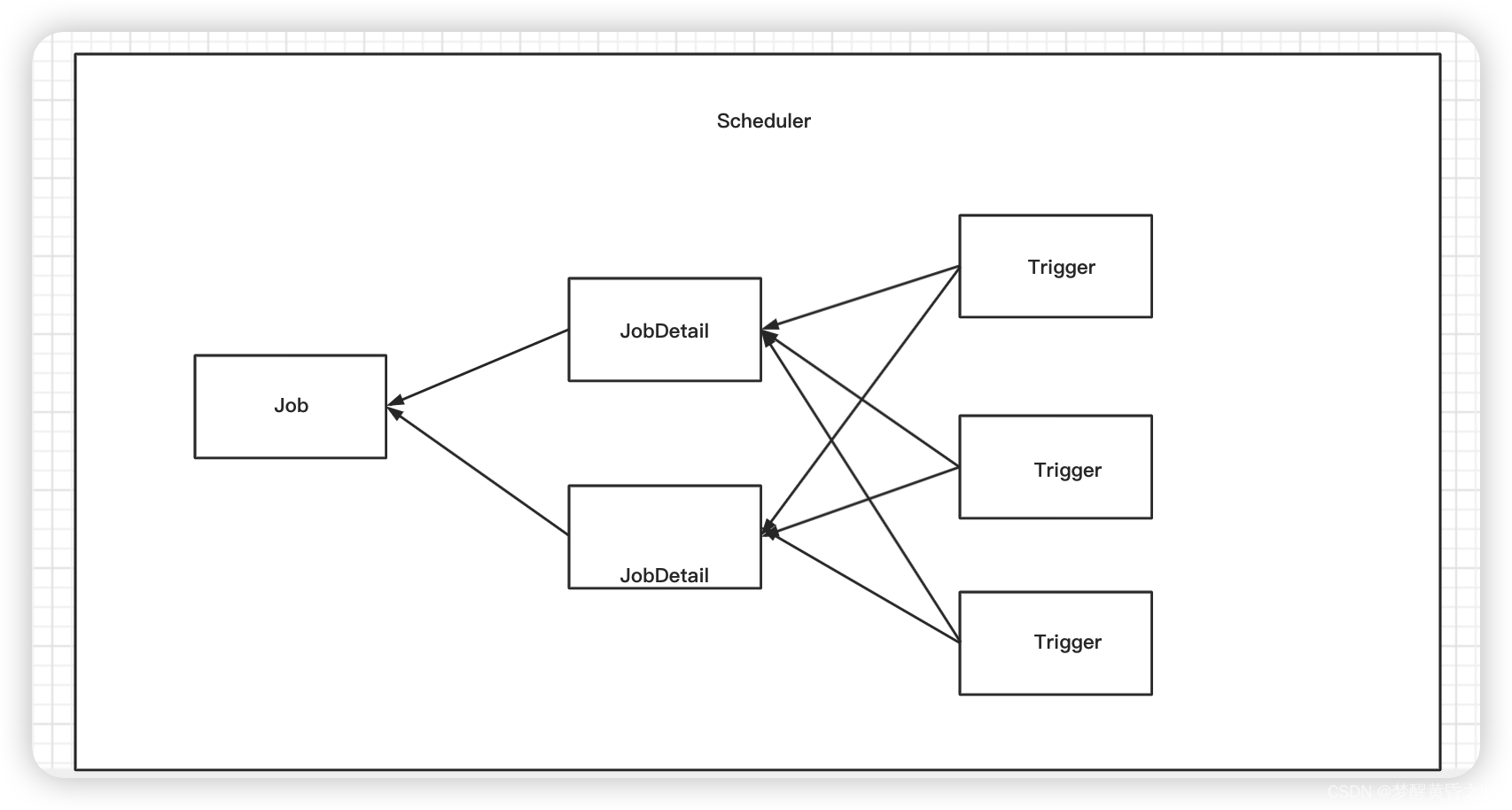 - scheduler:可以理解为定时任务的工作容器或者说是工作场所,所有定时任务都是放在里面工作,可以开启和停止。