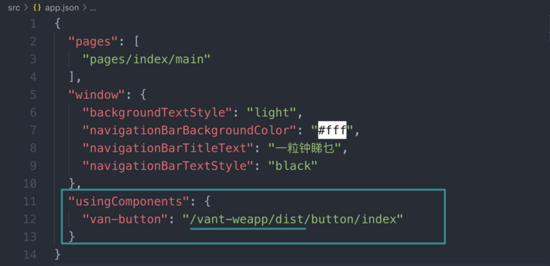 打开Vant Weapp的官网找一个button的例子测试下,但是使用之前需要在app.json文件中配置引入组件。