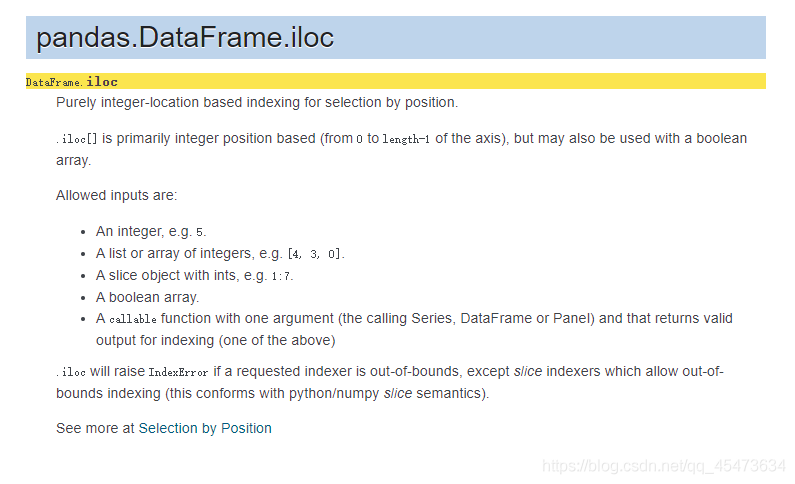 目录 第一种 整数做索引 第二种 列表或数组做索引 第三种 利用切片做索引 第四种 Boolean数组做索引 第五种 带一个参数的可调用函数做索引 今天学习时遇到了这个方法,为了加深理解做一下笔记. 这是该方法的文档,从中可以看出,中括号里允许输入可情形有5种.此外,iloc方法既可以索引行数据,也可以列数据. //首先创建DataFrame import pandas as pd import numpy as np df = pd.DataFrame({'城市':['北京','广州', '天