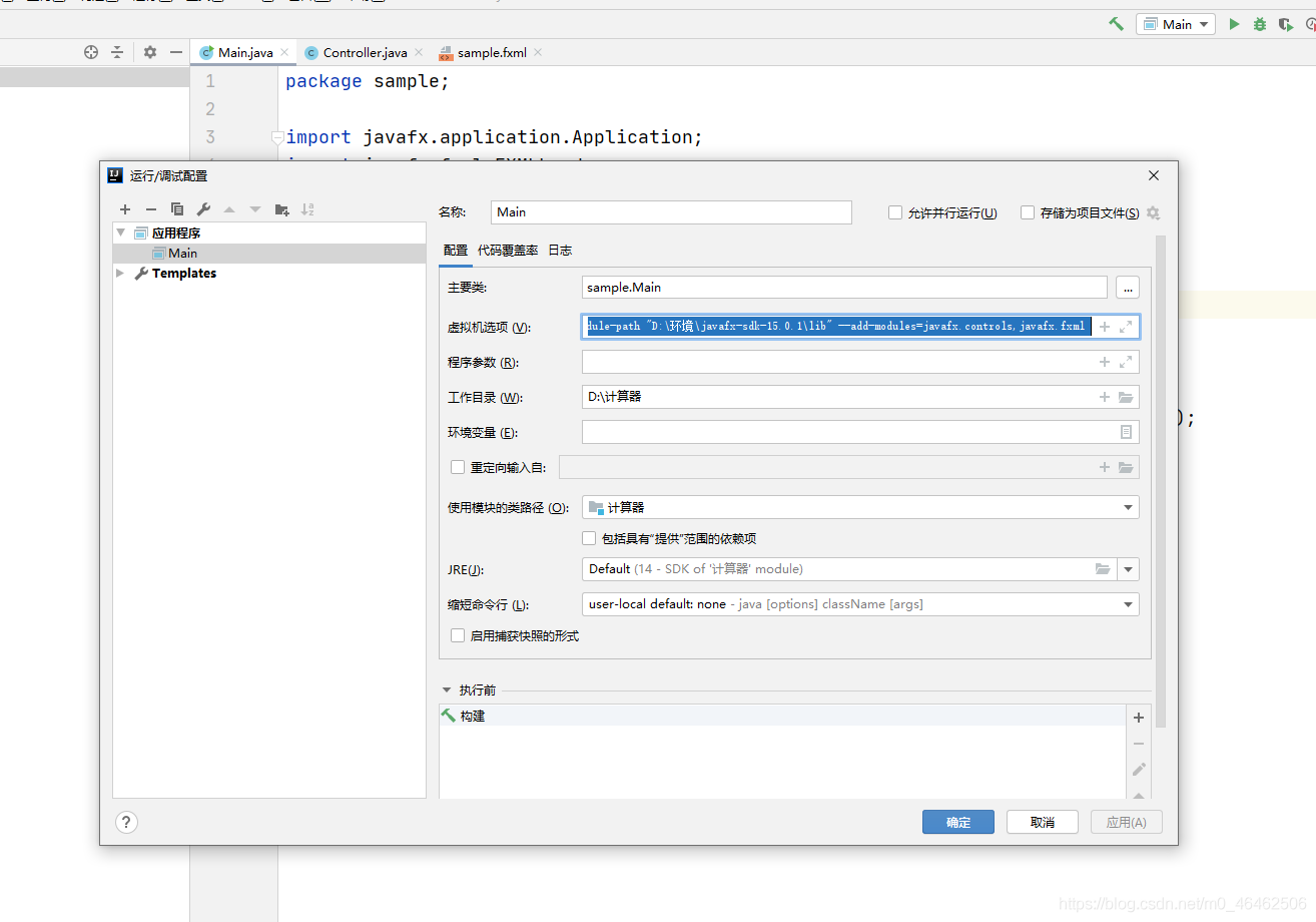 9.然后配置VM option,输入–module-path “D:\环境\javafx-sdk-15.0.1\lib” --add-modules=javafx.controls,javafx.fxml