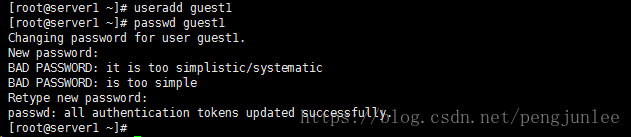 useradd guest1 //创建新用户 passwd guest1 //设置新用户登录密码