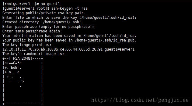 无需指定口令密码,直接回车,命令执行完毕后会在 guest1 用户的家目录中(/home/guest1/.ssh)生成两个文件: