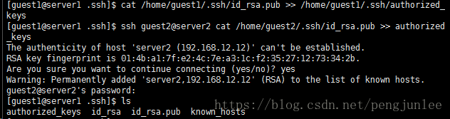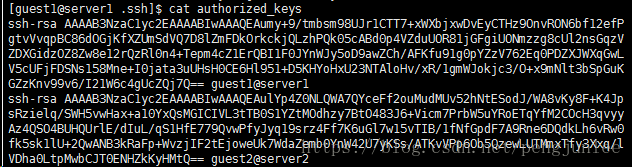 cat /home/guest1/.ssh/id_rsa.pub >> /home/guest1/.ssh/authorized_keys ssh guest2@server2 cat /home/guest2/.ssh/id_rsa.pub >> authorized_keys