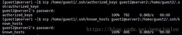 # scp [要传输的本地文件] [远程主机用户名]@远程主机ip或主机名:[文件要传输到的目标位置] scp /home/guest1/.ssh/authorized_keys guest2@server2:/home/guest2/.ssh/authorized_keys scp /home/guest1/.ssh/known_hosts guest2@server2:/home/guest2/.ssh/known_hosts