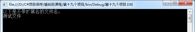 string Str1=@"C:\Users\Administrator\Desktop\测试文件.txt"; Console.WriteLine("以下是不带扩展名的文件名:"); Console.WriteLine(Path.GetFileNameWithoutExtension(Str1)); Console.ReadKey();