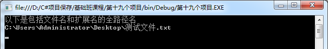string Str1=@"C:\Users\Administrator\Desktop\测试文件.txt"; Console.WriteLine("以下是包括文件名和扩展名的全路径名"); Console.WriteLine(Path.GetFullPath(Str1)); Console.ReadKey();