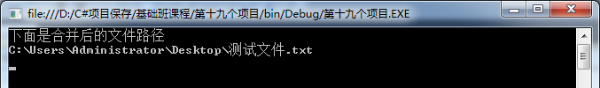 string Str1=@"C:\Users\Administrator\"; string Str2=@"Desktop\测试文件.txt"; Console.WriteLine("下面是合并后的文件路径"); Console.WriteLine(Path.Combine(Str1,Str2)); Console.ReadKey();