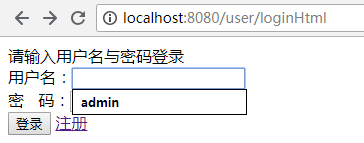 <!DOCTYPE html> <html lang="en"> <head> <meta charset="UTF-8"> <title>用户登录</title> </head> <body> 请输入用户名与密码登录 <form action="/user/userLogin" method="post"> 用户名:<input type="text" name="username" /><br> 密 码:<input type="password" name="password" /><br> <input type="submit" value="登录" /> <a href="/user/registerpage" target="_blank">注册</a> </form> </body> </html>