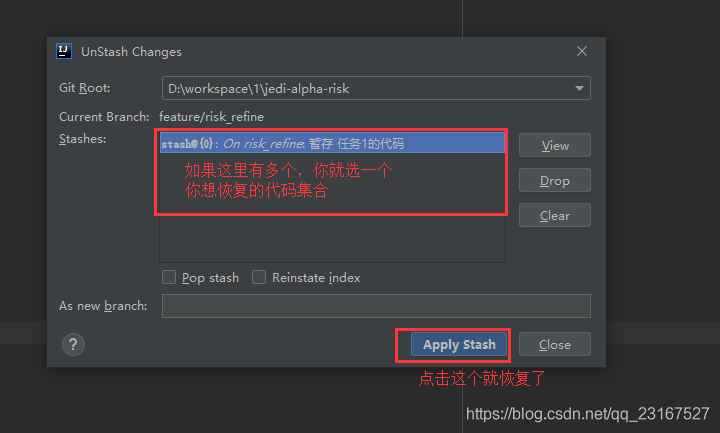 9.2如果你恢复代码之后就不想再打开Unstash Changes…窗口,执行删除。那么你可以这样做:在点击Apply Stash按钮之前,勾选上Pop stash复选框在点击Apply Stash按钮(额,当你勾选了Pop stash,Apply Stash按钮就变成了Pop Stash按钮),恢复之后idea自动就删除了你恢复的代码集合,如图: