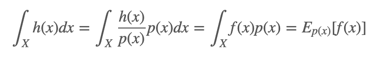 我们将 h(x) 分解成一个函数 f(x) 和一个概率密度函数 p(x) 的乘积,进而又将问题转换为求解函数 f(x) 关于密度函数 p(x) 的数学期望