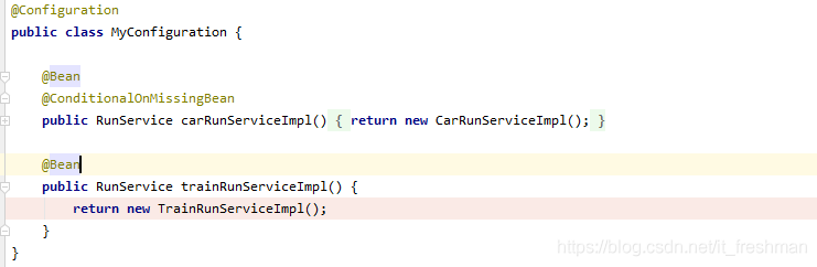 我们在配置类中,注入RunService的实现bean,并通过@ConditionalOnMissingBean来判断是否注入。