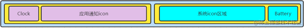 其中我们需要定制的从UI设计稿中可以看出,是三个区域,时钟, 系统icon,电池, 应用通知在这个项目中不需要,可以直接去掉通知信息功能,就不会显示出来。clock和battery都是自定义控件,比较好处理。重点看下系统icon实现。