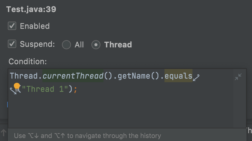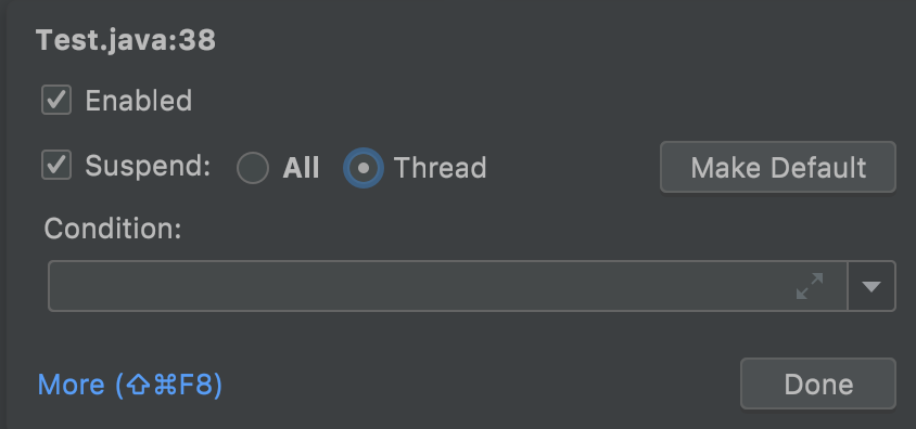 另外如果只想让某个线程在断点处停止,可以使用断点的Condition,如上面的代码中只想让第一个线程暂停,则可以在断点处右键,在Condition中填入Thread.currentThread().getName().equals(“Thread 1”);