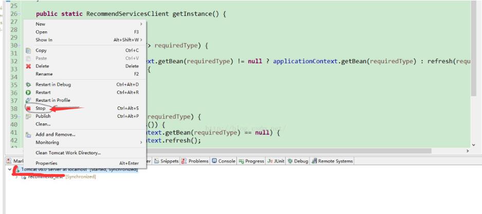 1.在tomcat上右键选择“stop” 。停止eclipse内的Tomcat服务器