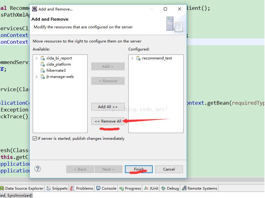 2.在tomcat上右键选择“Add and Remove”,删除该容器中部署的项目,点击”remove all“,即可移除所有项目,完了”finish“