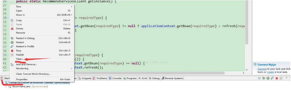 3.在tomcat上右键选择“clean”,清除该容器相关数据