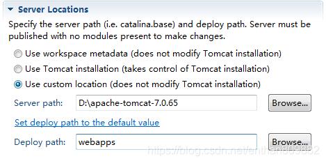 5.找到servers location,选择第二个(User tomcat Installation);修改deploy path为你自己tomcat的webapps ,最后“ctr+s”保存关闭
