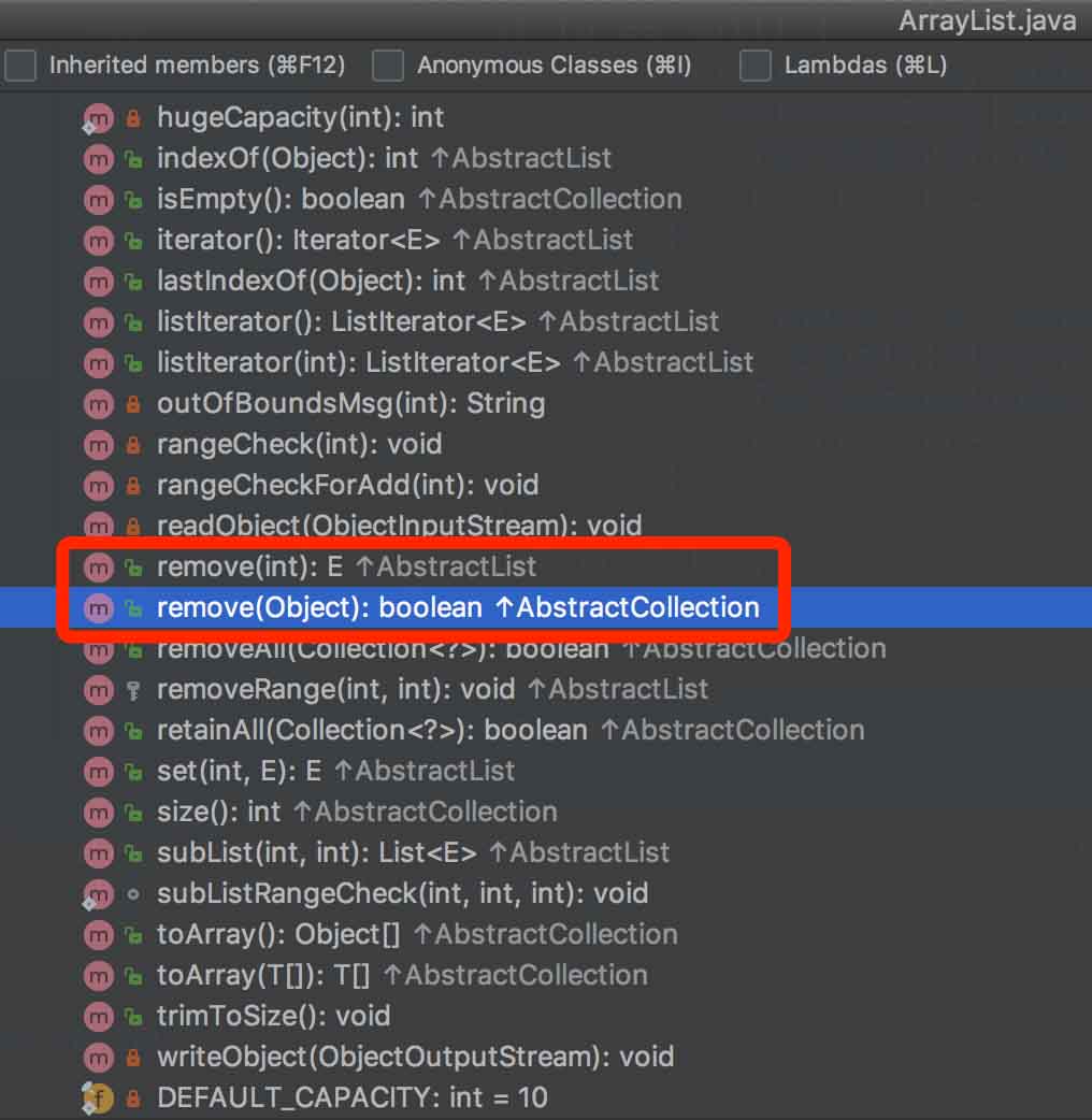 查看源码,发现public E remove(int index)是ArrayList父类AbstractList的方法;public boolean remove(Object o)是AbstractList的父类AbstractCollection中的方法。