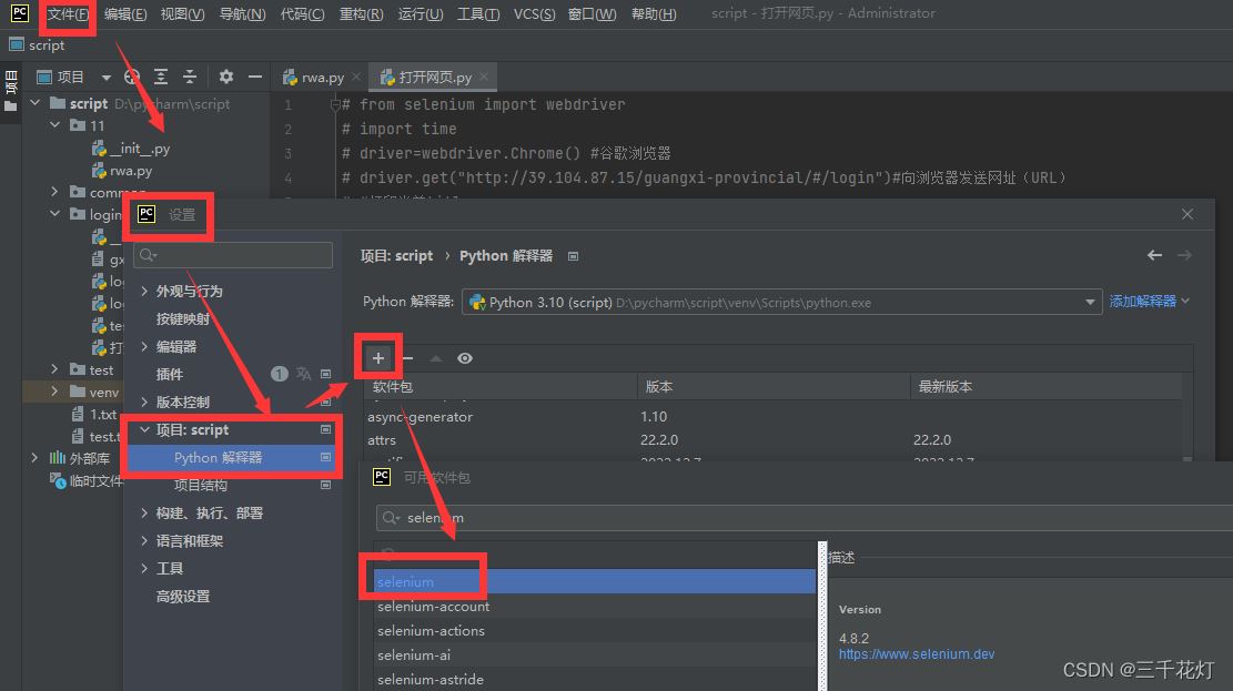 文件–>设置—>项目:script---->python解释器---->+selenium