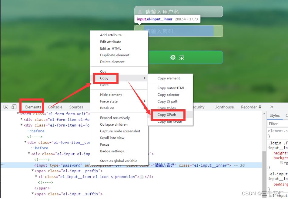 谷歌浏览器---->检查---->elements—>利用最左边的箭头选择标签---->右击复制xpath定位元素