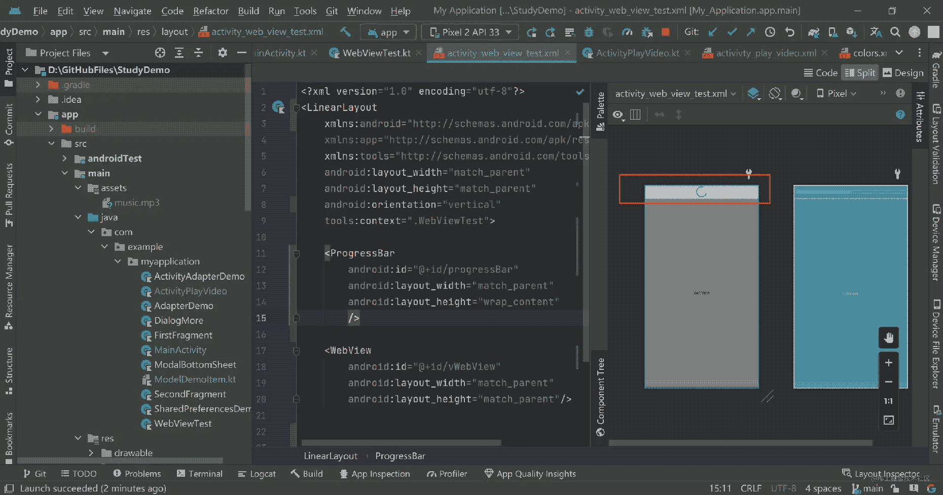 但是正常来说,web页面我们一般不使用圈的方式,而是条形,其实很简单,只要改ProgressBar控件在XML布局中的一个属性: