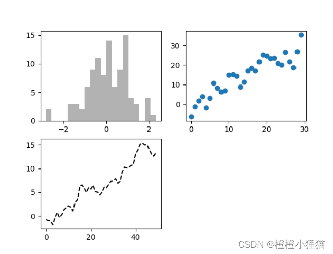 import matplotlib.pyplot as plt import numpy as np # 拿起画板 fig = plt.figure() # 在画板上贴上画纸 ax1 = fig.add_subplot(221) ax2 = fig.add_subplot(222) ax3 = fig.add_subplot(223) # 一步完成(直接拿起画板和画纸)----------------- # ax1 = plt.subplot(221) # ax2 = plt.subplot(222) # ax3 = plt.subplot(223) # ---------------------------------------- # 在画纸上作图 ax1.hist(np.random.randn(100), bins=20, color='k', alpha=0.3) ax2.scatter(np.arange(30), np.arange(30) + 3 * np.random.randn(30)) ax3.plot(np.random.randn(50).cumsum(), 'k--') plt.show()
