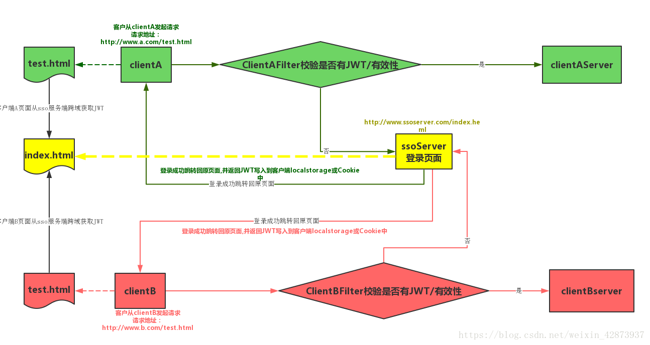 到此,后台服务的配置已经完成,下一步就需要前端页面将JWT令牌从response响应头中取出,然后存入localstorage或cookie中。但是遇到跨域场景,处理起来就会比较复杂,因为一旦在浏览器中跨域将获取不到localstorage中的JWT令牌。例如www.a.com域下的JWT,在www.b.com域下是获取不到的,所以我选择了一种页面跨域的方式进行处理,使用iframe+H5的postMessage(参考博文),具体我使用代码分享的方式来分析。
