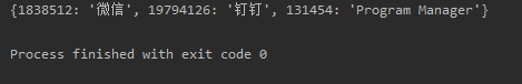import win32gui hwnd_title = dict() def get_all_hwnd(hwnd, mouse): # 判断句柄是否为窗口、窗口是否允许输入、窗口是否可视 if win32gui.IsWindow(hwnd) and win32gui.IsWindowEnabled(hwnd) and win32gui.IsWindowVisible(hwnd): hwnd_title.update({hwnd: win32gui.GetWindowText(hwnd)}) # EnumWindows枚举所有顶层窗口 win32gui.EnumWindows(get_all_hwnd, 0) # 打印出所有窗口名不为空的窗口 for key in list(hwnd_title): if hwnd_title[key] is "": del hwnd_title[key]