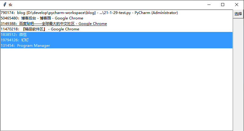 import tkinter as tk root = tk.Tk() root.geometry("800x400") # 列表显示所有顶层窗口 listBox = tk.Listbox(root, selectmode="multiple") listBox.pack(side="left", expand="yes", fill="both") for i, j in hwnd_title.items(): if j is not "": listBox.insert("end", str(i) + ":" + j) bt = tk.Button(root, text='选择') bt.pack() root.mainloop()