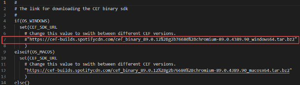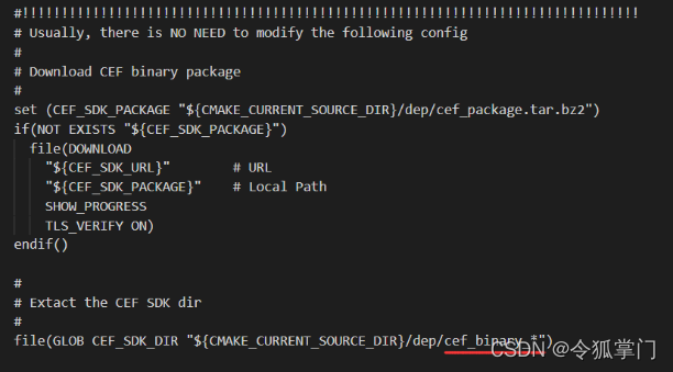 在编译前,需要做些配置修改,由于QCefView依赖于CEF,在用CMake配置项目时,会下载CEF工程,如果没有比较好的网络环境,可能无法下载CEF, 不过可以手动下载CEF, 放到指定目录即可。打开QCefView\CefViewCore\CefConfig.cmake我是windows编译, 注释掉CEF的下载链接,也就是第7行,例如我的注释: