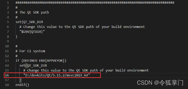 打开QCefView根目录的QtConfig.cmake, 将第16行指定为你的Qt路径,例如我的Qt路径
