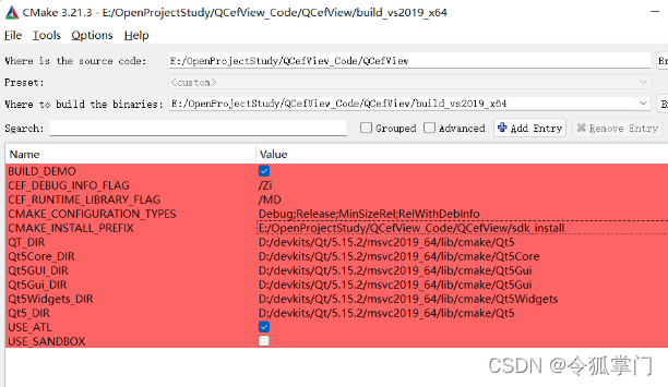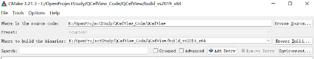 2 打开CMake GUI, 找到QCefViwe目录,指定源码目录和解决方案目录build_vs2019_x64,,例如我的设置:
