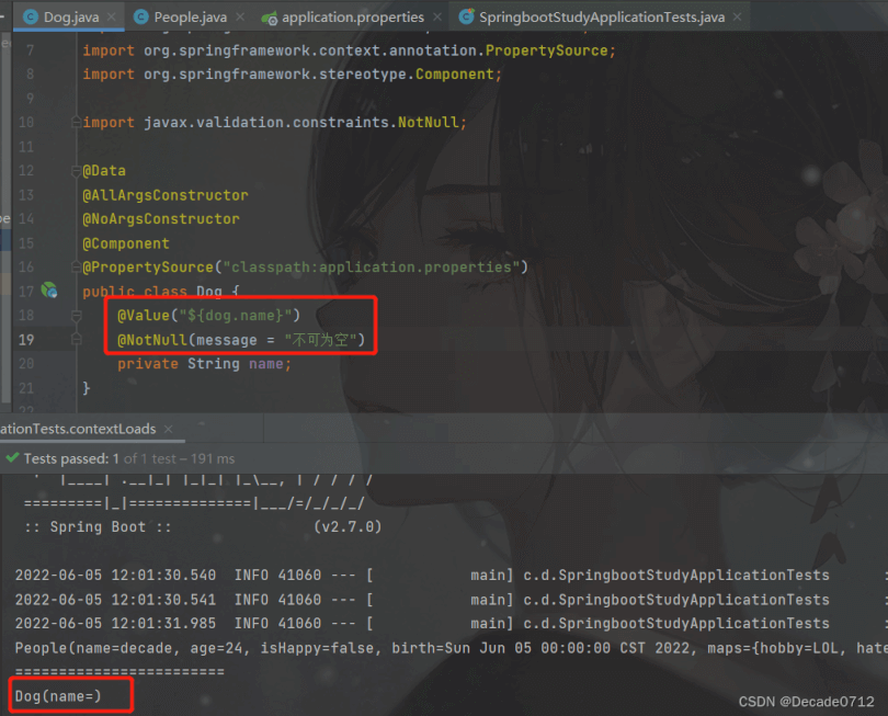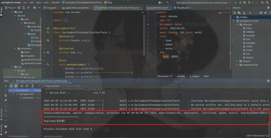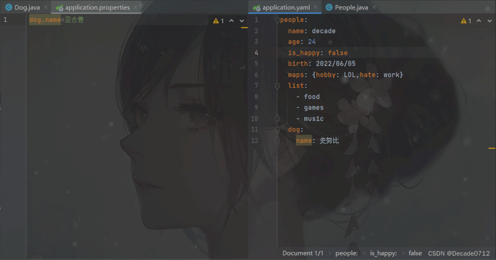 该注解的属性prefix表示要在yaml文件中寻找以改属性值为开头的配置项进行绑定,例如@ConfigurationProperties(prefix = “people”)