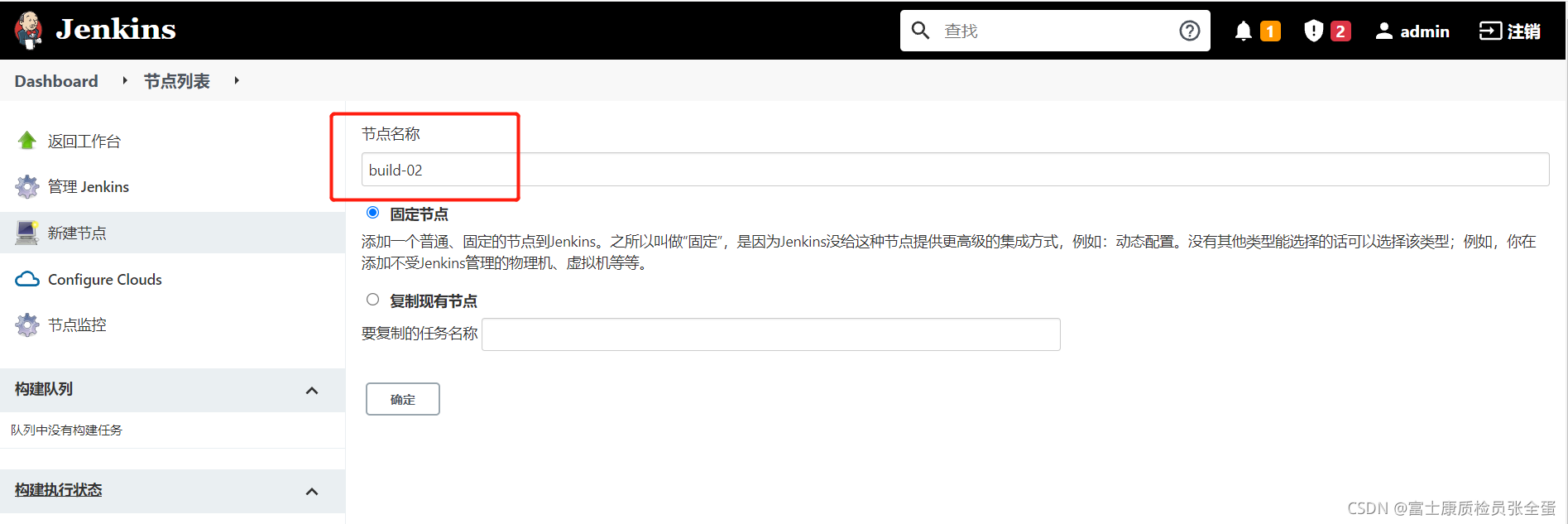 在命令行中启动节点 java -jar agent.jar -jnlpUrl http://139.198.166.235:8080/computer/build%2D02/jenkins-agent.jnlp -secret 942d7e769a43f65388751ee954af20e90fa0c5f8bdb19e0584db4cc61adab8ba -workDir "/var/jenkins" Run from agent command line, with the secret stored in a file: echo 942d7e769a43f65388751ee954af20e90fa0c5f8bdb19e0584db4cc61adab8ba > secret-file java -jar agent.jar -jnlpUrl http://139.198.166.235:8080/computer/build%2D02/jenkins-agent.jnlp -secret @secret-file -workDir "/var/jenkins"