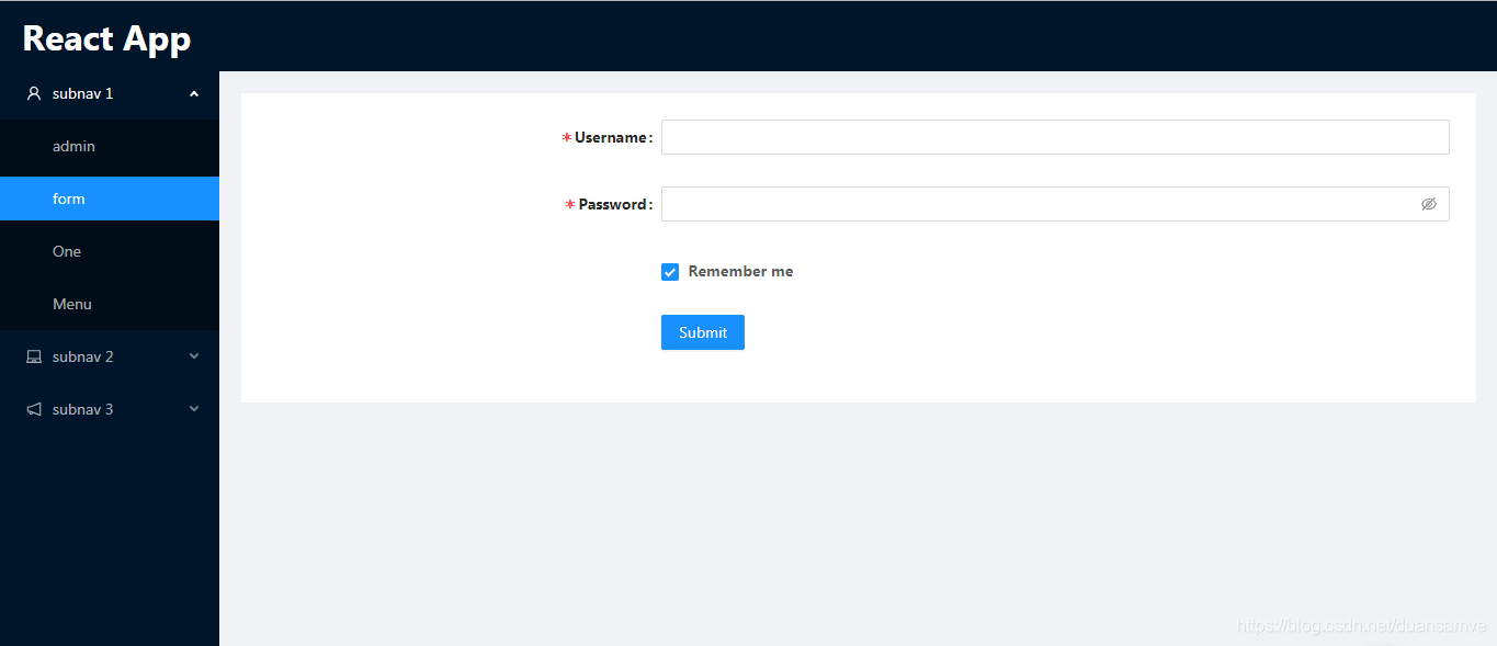 import React from 'react' import { Layout, Menu } from 'antd'; import { UserOutlined, LaptopOutlined, NotificationOutlined } from '@ant-design/icons'; import { HashRouter, Route, Link } from 'react-router-dom' import Admin from './Admin' import FormCom from './FormCom' import One from './One' import ButtonCom from './ButtonCom' import MenuCom from './MenuCom' import StepsCom from './StepsCom' import TabsCom from './TabsCom' import TableCom from './TableCom' import MessageCom from './MessageCom' import NotificationCom from './NotificationCom' import ProgressCom from './ProgressCom' import SpinCom from './SpinCom' import BadgeCom from './BadgeCom' const { SubMenu } = Menu; const { Header, Content, Sider } = Layout; export default class First extends React.Component { constructor() { super(); } //只展开当前父级菜单 begin rootSubmenuKeys = ['sub1', 'sub2', 'sub3']; state = { openKeys: ['sub1'], }; onOpenChange = openKeys => { const latestOpenKey = openKeys.find(key => this.state.openKeys.indexOf(key) === -1); if (this.rootSubmenuKeys.indexOf(latestOpenKey) === -1) { this.setState({ openKeys }); } else { this.setState({ openKeys: latestOpenKey ? [latestOpenKey] : [], }); } }; //只展开当前父级菜单 end render() { return (<div> <Layout> <HashRouter> <Header className="header" style={{ position: 'fixed', zIndex: 1, width: '100%', paddingLeft: '20px'}}> <div className="logo" style={{fontSize: '32px', color: '#ffffff', fontWeight: 'bold'}}>React App</div> <Menu theme="dark" mode="horizontal" defaultSelectedKeys={['1']}> {/*<Menu.Item key="1">nav 1</Menu.Item> <Menu.Item key="2">nav 2</Menu.Item> <Menu.Item key="3">nav 3</Menu.Item>*/} </Menu> </Header> <Layout> <Sider width={200} className="site-layout-background" style={{ overflow: 'auto', height: '100vh', position: 'fixed', left: 0, }}> <Menu theme="dark" mode="inline" defaultSelectedKeys={['2']} defaultOpenKeys={['sub1']} style={{ height: '100%', paddingTop: '60px', borderRight: 0 }} onOpenChange={this.onOpenChange} openKeys={this.state.openKeys} > <SubMenu key="sub1" icon={<UserOutlined />} title="subnav 1"> <Menu.Item key="1"><Link to={`${this.props.match.path}/admin`}>admin</Link></Menu.Item> <Menu.Item key="2"><Link to={`${this.props.match.path}/form`}>form</Link></Menu.Item> <Menu.Item key="3"><Link to={`${this.props.match.path}/one`}>One</Link></Menu.Item> <Menu.Item key="4"><Link to={`${this.props.match.path}/menu`}>Menu</Link></Menu.Item> </SubMenu> <SubMenu key="sub2" icon={<LaptopOutlined />} title="subnav 2"> <Menu.Item key="5"><Link to={`${this.props.match.path}/step`}>Step</Link></Menu.Item> <Menu.Item key="6"><Link to={`${this.props.match.path}/tabs`}>Tabs</Link></Menu.Item> <Menu.Item key="7"><Link to={`${this.props.match.path}/table`}>Table</Link></Menu.Item> <Menu.Item key="8"><Link to={`${this.props.match.path}/message`}>Message</Link></Menu.Item> </SubMenu> <SubMenu key="sub3" icon={<NotificationOutlined />} title="subnav 3"> <Menu.Item key="9"><Link to={`${this.props.match.path}/notification`}>Notification</Link></Menu.Item> <Menu.Item key="10"><Link to={`${this.props.match.path}/progress`}>ProgressCom</Link></Menu.Item> <Menu.Item key="11"><Link to={`${this.props.match.path}/spin`}>Spin</Link></Menu.Item> <Menu.Item key="12"><Link to={`${this.props.match.path}/badge`}>Badge</Link></Menu.Item> <Menu.Item key="13"><Link to={`${this.props.match.path}/button`}>Button</Link></Menu.Item> </SubMenu> </Menu> </Sider> <Layout style={{ padding: '84px 20px 20px', marginLeft: 200}}> <Content className="site-layout-background" style={{ padding: 24, margin: 0 }} > <Route path={`${this.props.match.path}/admin`} exact component={Admin}></Route> <Route path={`${this.props.match.path}/form`} component={FormCom}></Route> <Route path={`${this.props.match.path}/one`} component={One}></Route> <Route path={`${this.props.match.path}/menu`} component={MenuCom}></Route> <Route path={`${this.props.match.path}/step`} component={StepsCom}></Route> <Route path={`${this.props.match.path}/tabs`} component={TabsCom}></Route> <Route path={`${this.props.match.path}/table`} component={TableCom}></Route> <Route path={`${this.props.match.path}/message`} component={MessageCom}></Route> <Route path={`${this.props.match.path}/notification`} component={NotificationCom}></Route> <Route path={`${this.props.match.path}/progress`} component={ProgressCom}></Route> <Route path={`${this.props.match.path}/spin`} component={SpinCom}></Route> <Route path={`${this.props.match.path}/badge`} component={BadgeCom}></Route> <Route path={`${this.props.match.path}/button`} component={ButtonCom}></Route> </Content> </Layout> </Layout> </HashRouter> </Layout> </div>) } }