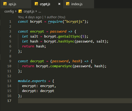 我在一个js模块中定义了两个方法,一个加密,一个解密。在加密算法中,首先我们需要生成盐,所谓盐,就是先在明文密码中混入一些无规则的字符。传入的数字越大,代表混入的盐越复杂。最后通过hashSync方法生成加密密码并返回。而解密方法就更加简单,直接调用封装的compareSync方法进行明文密码与加密密码比对。