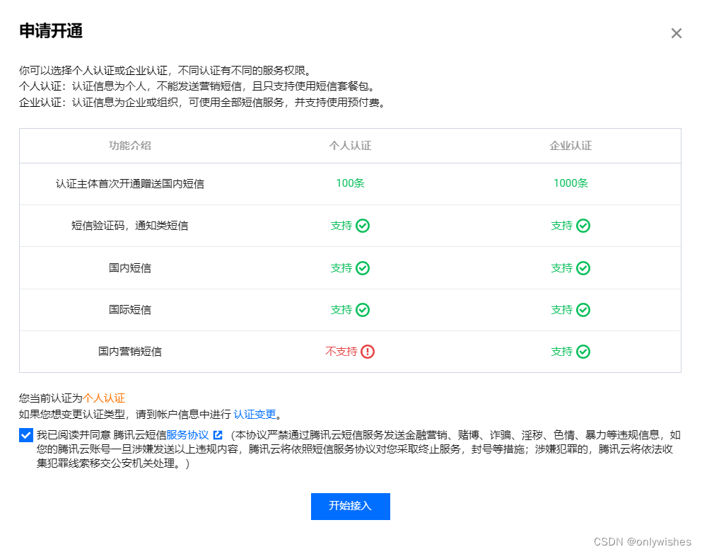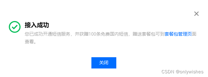 如上图所示,我们会看到要我们申请开通短信服务,开通后它会免费送我们100条国内短信。