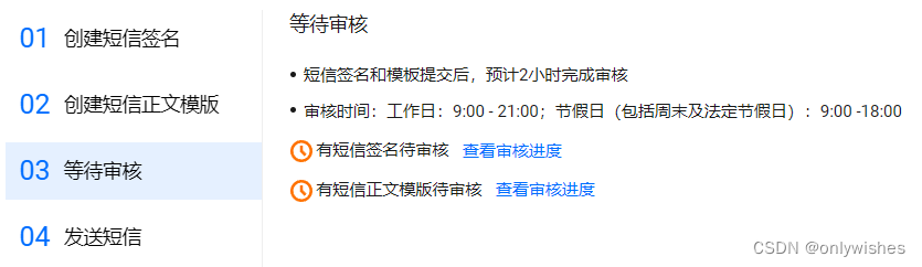配置完毕后就等待审核,审核完成后我们就可以使用接口发送短信了。