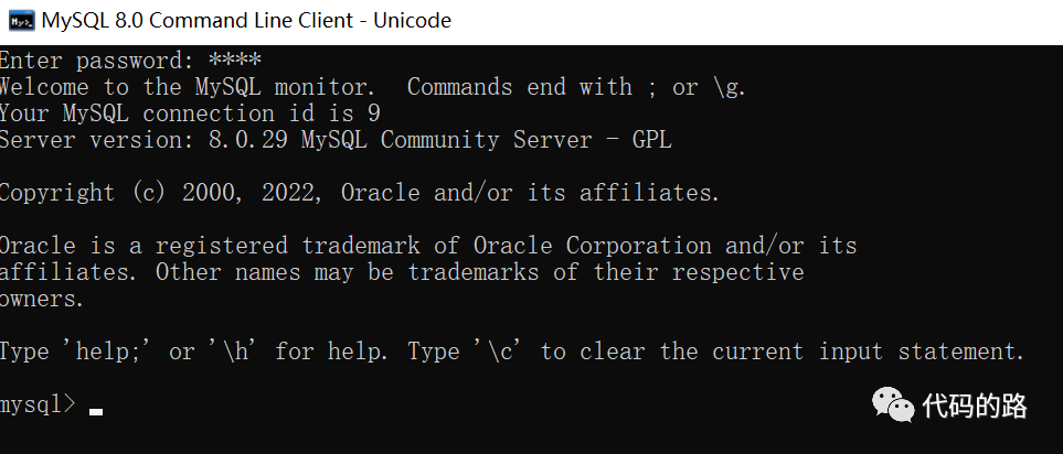 在“开始”菜单打开“MySQL 8.0 Command Line Client - Unicode”,输入密码(即root),出现如下提示,即安装成功。