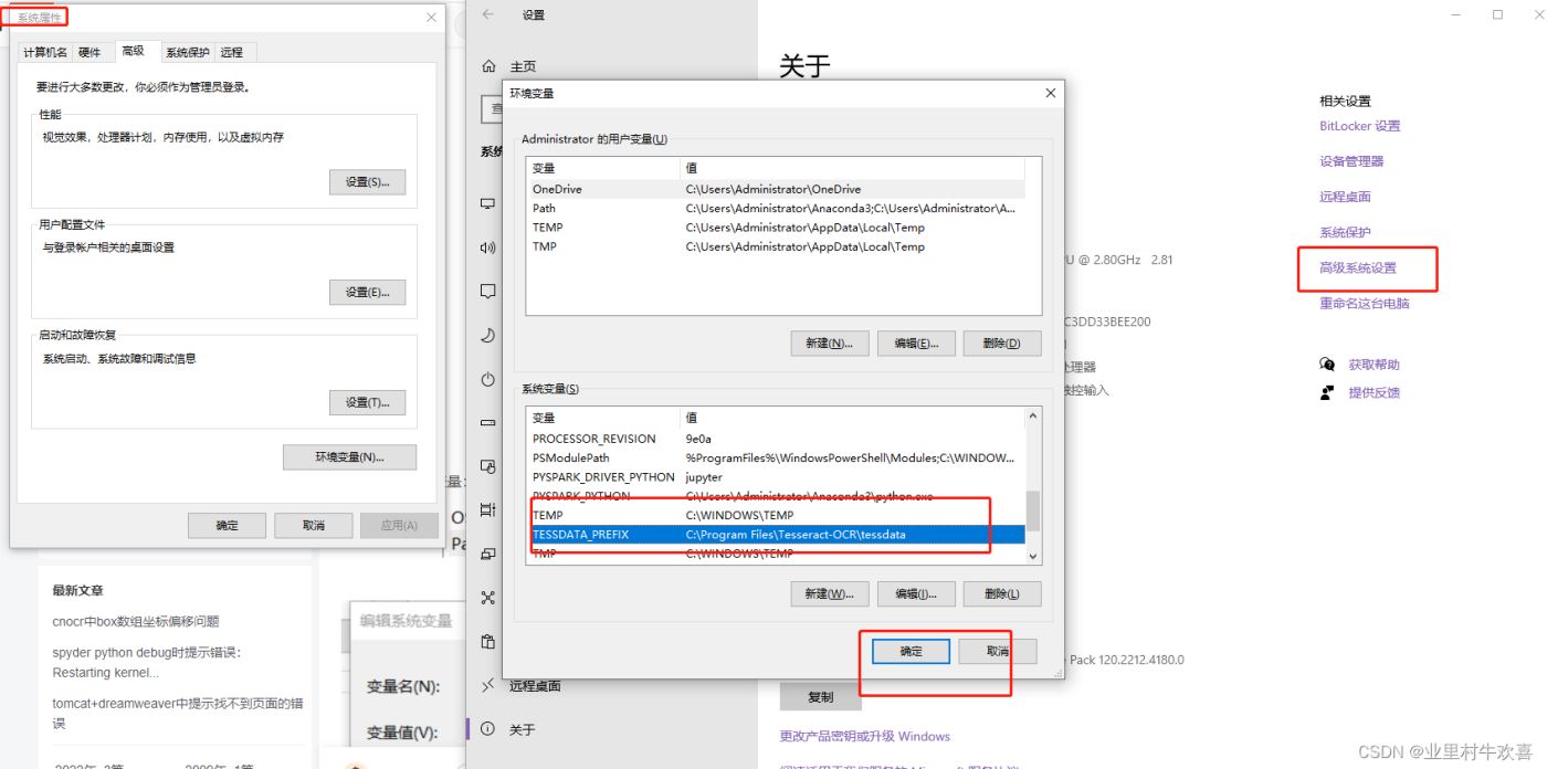 【从C:\Program Files\Tesseract-OCR安装目录下,直接把tessdata 文件夹里的内容都复制到C:\Users\Administrator\Anaconda3,另外tessdata 文件夹里chi_sim.traineddata,eng.traineddata文件需要复制到C:\ProgramData\Anaconda3下,不然后面运行程序会提示找不到文件,配置好环境变量也不行!】(据说是霸王条款)