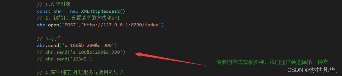那么如何给POST请求设置参数呢?因为传参方式不同,所以当然不是和GET请求相同,而是在Ajax请求数据的第三步发送 send 请求时传递数据,请看如下:
