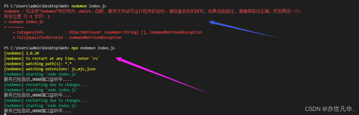执行上面的命令可能会出现系统不允许的报错信息,在命令前面加上 npx 即可。 成功画面如下图这样一来我们就免去了修改代码时来回重启服务的繁琐。