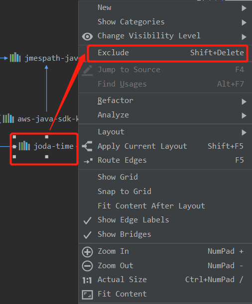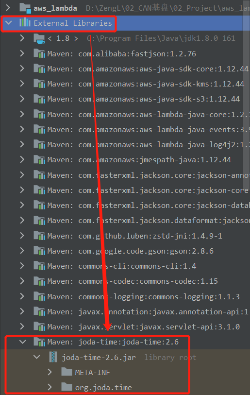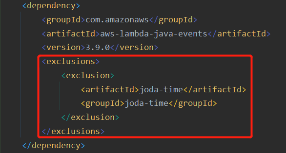 示例:添加exclusion属性,将aws-lambda-java-events的一个依赖包joda-time去除