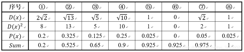 从上表可以直观的看到,1号,2号,3号,4号总的概率之和为0.9,这4个点正好是离第一个初始聚类中心(即6号点)较远的四个点,因此选取的第二个聚类中心大概率会落在这4个点中的一个,其中2号点被选作为下一个聚类中心的概率最大。