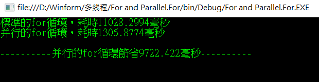 Console.WriteLine("----------标准的for循環節省{0}毫秒----------", (parallelTime - standerTime));