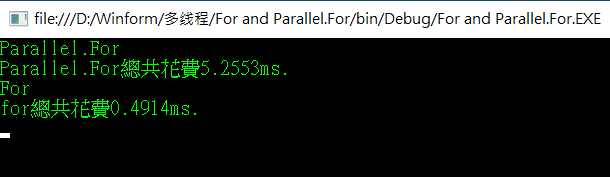 Console.WriteLine("并行的for循環,耗時{0}毫秒", parallelTime);